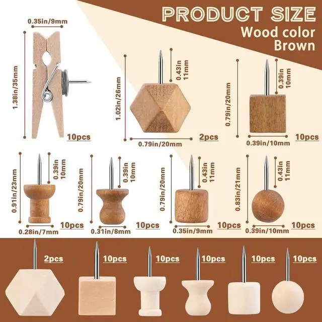 - The wooden push pins come with 7 types, Simple and Stylish.