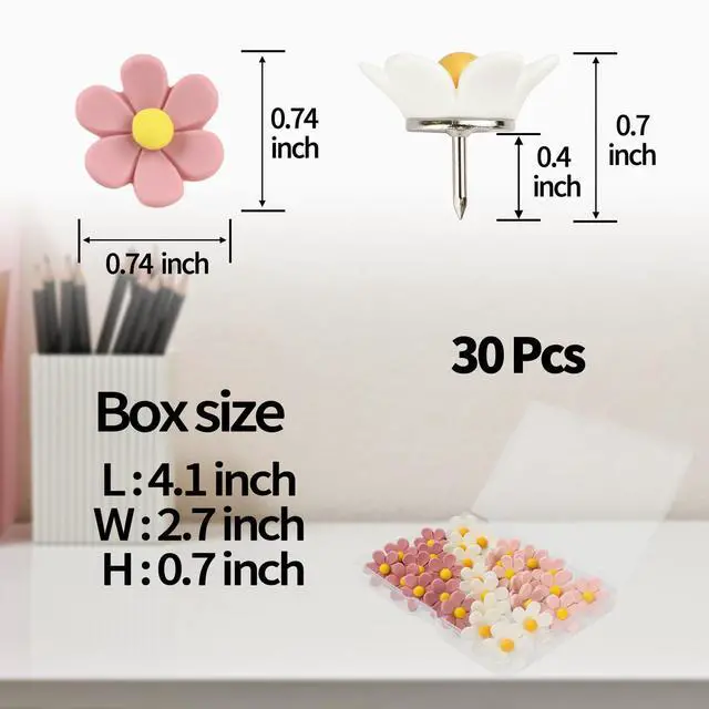 Delicate Thumb Tacks: Measures 0.74" L x 0.74"W x 0.7" H(19 x19 x 18 mm), weigh 0.07 ounces each push pins. Lightweight but toughly made for daily use.