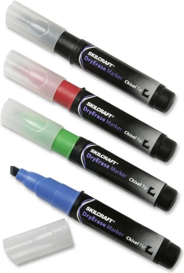 Dry-Erase Markers, Low-Odor, Chisel Tip, 4/ST, BE/BK/RD/GN