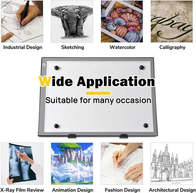 - A3 LED Drawing Board - 17"x12" Light Box features large, illuminated surface, offering enough space for large sketch and unlimited art creation; Perfect tool for sketching, diamond painting, 2D animation, calligraphy, embossing, stenciling, tattoo transferring, sewing projects, stained glass, clearly illuminating the hard-to-see lines for vinyl weeding & X ray film viewing, also suitable for professional tracing in architecture