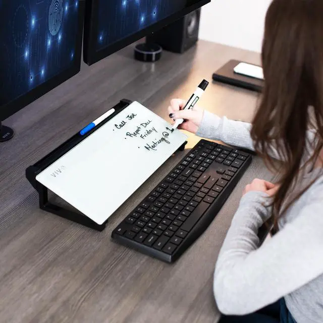 Take organization to a new level with the Small Glass Desktop Whiteboard (DESK-WB16D) from VIVO! Enjoy the convenience of having your notes in an easy-to-reach location, and save room on the floor and wall with this space-efficient solution. The tempered glass surface has an elegant appearance that doesnt streak or ghost, and enjoy open storage space beneath the frame for small accessories. Minimal assembly is required out of the boxsimply put together the support frame and its ready to use!