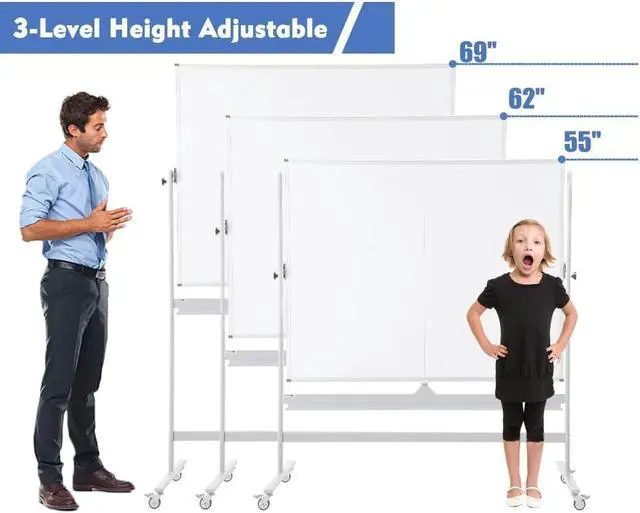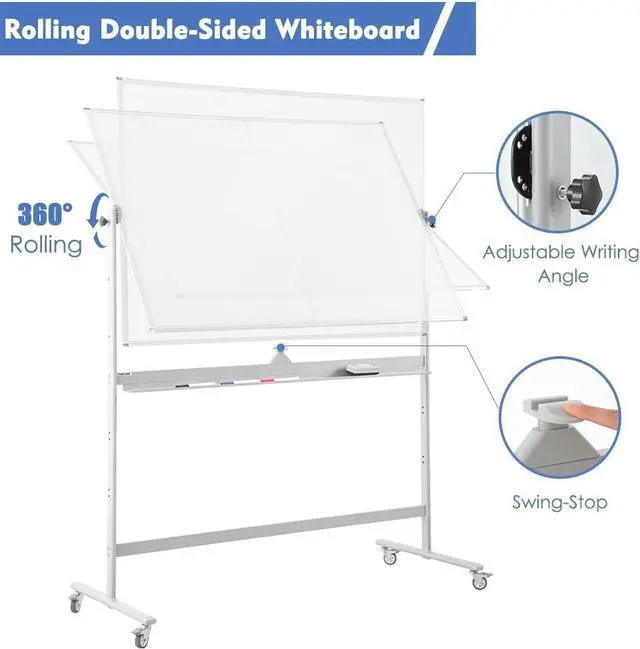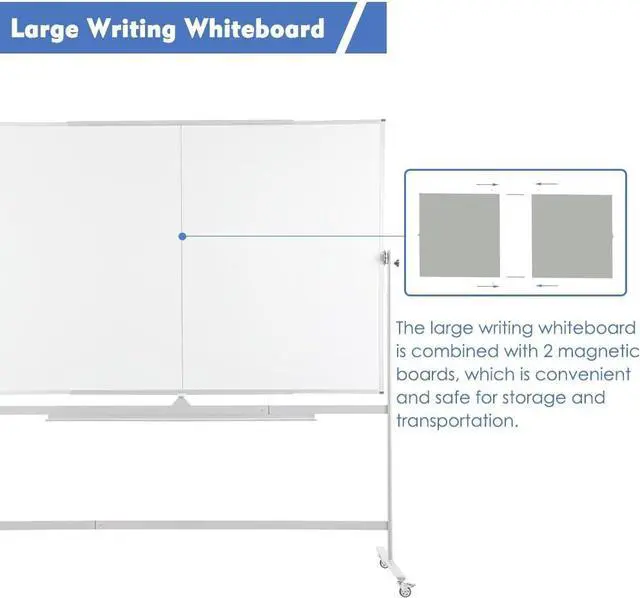 LARGE MOBILE WHITEBOARDThe large double-sided whiteboard offers 72" x 48" writing space for displaying your ideas, or making presentations at work. The mobile dry erase board with lockable wheels is ideal for teaching lessons, brainstorming and managing your work presentations, and practical for homeschool, classroom, and office