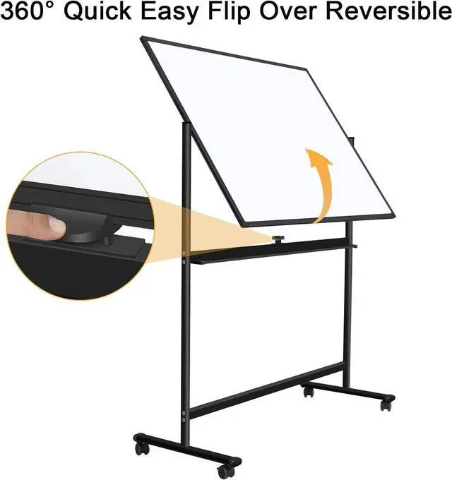 [Easy Flip Double Sided Magnetic Dry Erase Board & Portable Standing Whiteboard]: This mobile whiteboard have Quick Flip Over Reversible Feature, Flip the board to the other side with the press of a button. You have TWICE the writing space when you utilize BOTH sides of the portable whiteboard with stand, and the 2" (w) x 70.5" (L) pen tray can be placed with a lot of pens and erasers to facilitate your writing anytime and anywhere.