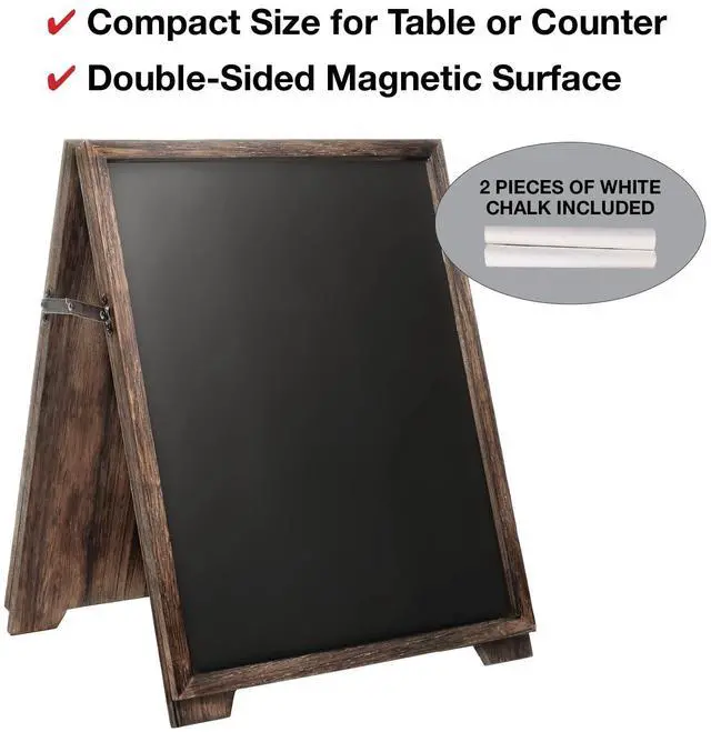 The Excello Global Products 13" x 17" Desktop Wooden A-Frame Chalkboard is the ideal addition to any space where versatility and style are key. Featuring a solid wooden frame, this compact A-frame chalkboard is both durable and elegant, making it perfect for a variety of uses. The double-sided magnetic chalkboard surfaces provide ample space for messages, menus, or creative drawings, and the full-length top piano hinge ensures stability. Two locking arms keep the board securely in place, whether displayed on a table or countertop. With its compact size and included white chalk, this chalkboard is ready for use right out of the box.