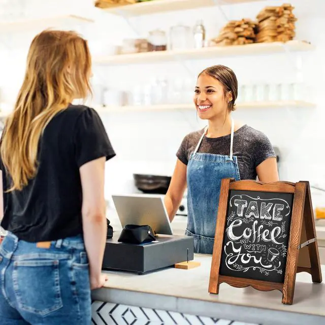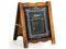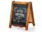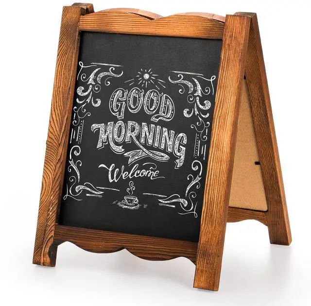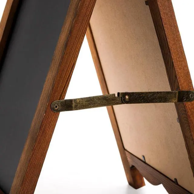 - Premium Quality Chalk Board - Frame is made of solid natural wood with rustic brown painting. A-frame construction design stands sturdy for outdoor use, quality steel hinges allow folding for space saving storage or easy transport.