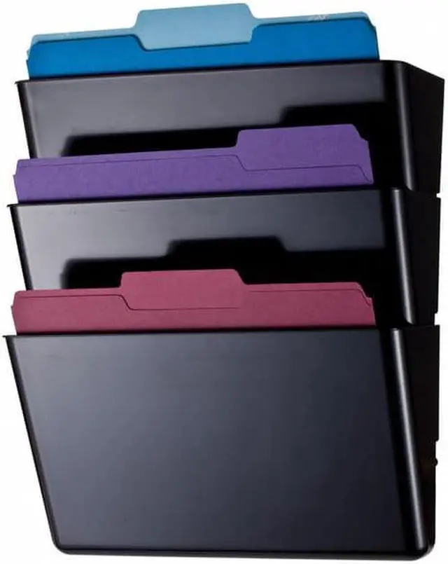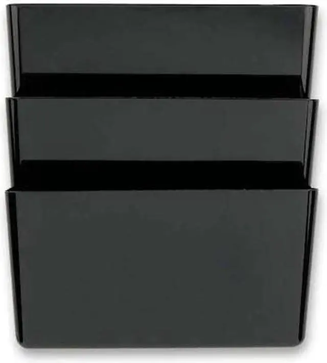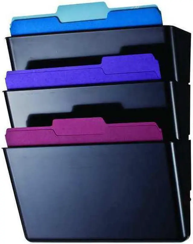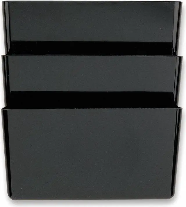 Wall File, Material Plastic, Color Black, Height 7 in, Width 13 in, Depth 4 1/8 in, Number of Compartments 3, Includes Double-Sided Tape. This item has been restricted from sale in the following state (s): []