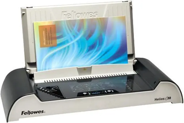 Ideal for medium duty home, office, or desktop use, the Fellowes Helios 30 Thermal Binding Machine binds up to 300 sheets. 1-3 minute thermal binding cycle with 4-minute heat-up time. HeatShield safety barrier prevents accidental contact with the heating plate. Includes a manual document measure for ease of use. Visual indicators signal when machine is ready for thermal binding and heat cycle begins once document is loaded. Ready-beep sounds when thermal binding cycle is complete. Internal clamps hold documents in place during thermal binding process. Auto shut-off safety feature prevents overheating. Stylish design folds flat for storage. For use with thermal binding covers only.