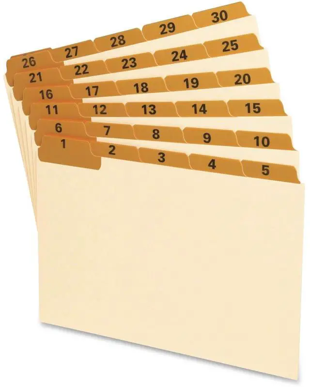Card guides feature laminated tabs for durability. Tabs are pre-printed with the numbers 1 to 31 for daily filing. Use the numbers to match up every day of the month. For easy access and identification, the staggered tabs line up in row, and each row includes all five tab positions. Card guides are made of heavy-duty manila stock.