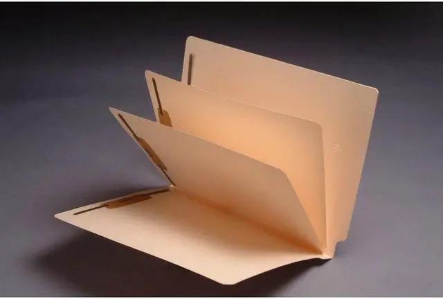LETTER SIZE: 12 1/4" W X 9 1/2" H, 11 3/4" W Body, Undercut to 11 3/8" Reinforced end tab 1/2" wide Designed for a 3/4" expansion Scored tick marks for label placement Top corners rounded, front and back 10% recycled content, 10% post-consumer material 14pt manila stock Front panel 9 1/2" high Front panel undercut 1/4" 2" bonded fasteners in position 1&3 2 - 11pt manila dividers installed into folder 2" bonded fasteners on the dividers