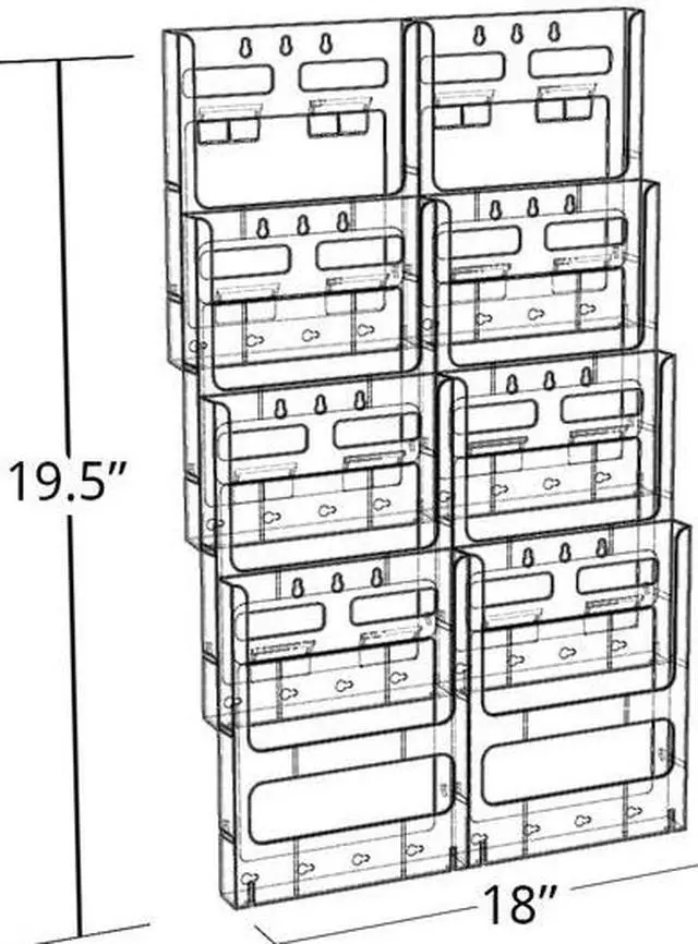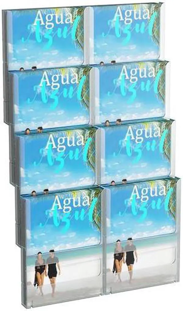Eight-pocket letter size wall mount display. Use for printed material measuring 8.5"W x 11"H. Add components to mount onto slatwall. Ships unassembled.