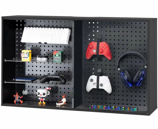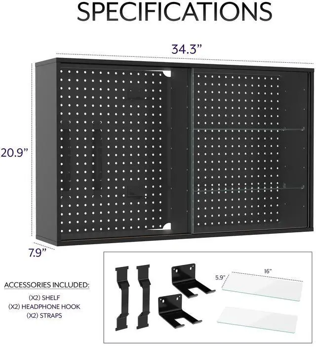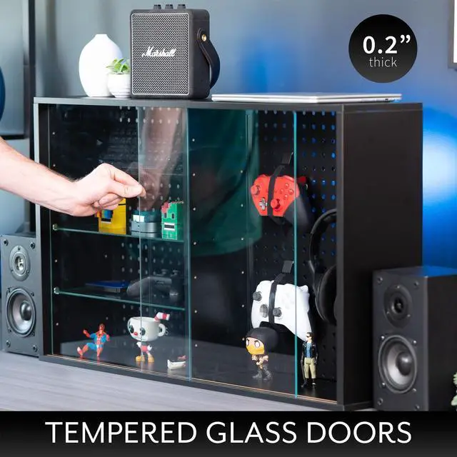 Display your favorite collectibles in style with the Black Pegboard Cabinet with Glass Door (LF-GDPC1) from Life Finds! Featuring tempered glass doors in the front and steel pegboard in the back, this cabinet is both aesthetic and functional. Equipped with glass shelves and pegboard accessories, you can store your supplies, figurines, decor, and more safely behind the sliding doors. Comes with wood stud and concrete wall mounting hardware, and it can also be used as a freestanding display piece!