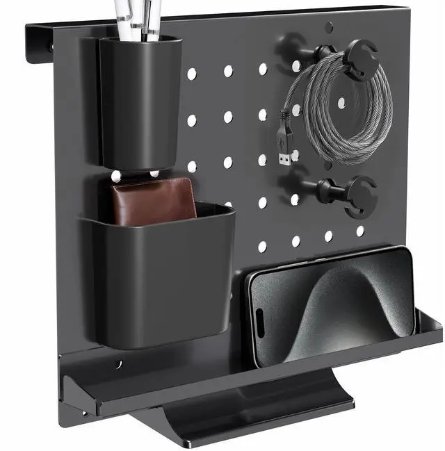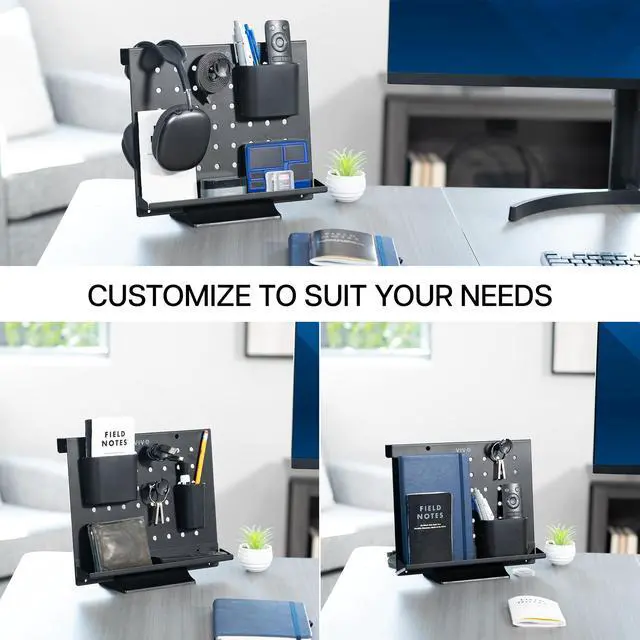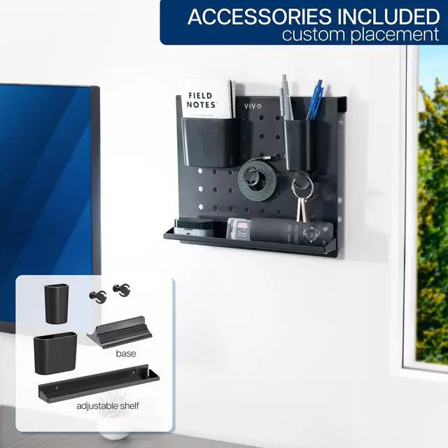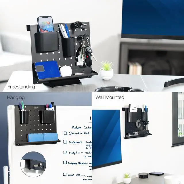 Enhance your workspace with the Black Pegboard Desk Organizer (PP-DK04F) from VIVO! This versatile product can be placed on a tabletop stand, hung on a whiteboard, or wall-mounted for endless display options. Featuring storage bins for writing utensils, wire posts for cord organization, and a storage tray for knick-knacks, tools, and more, this pegboard has you covered! The low profile design blends seamlessly into your space, and powder-coated steel provides sturdy support that lasts.