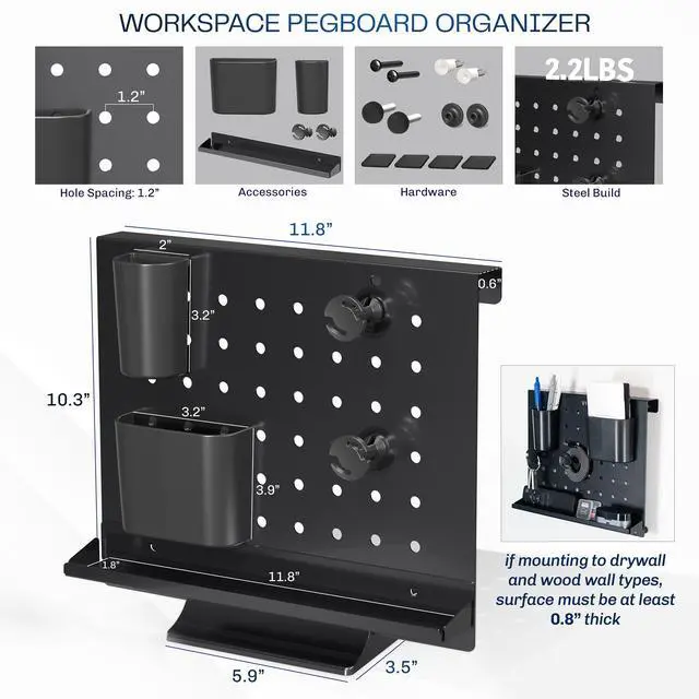 - Pegboard Dimensions: 11.8 x 9.8