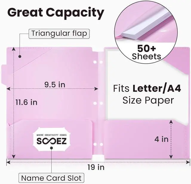 Stable & sturdy Material: Our folder is 0.35 mm thick. The thickness of our plastic folders exceeds that of our rivals' even twice thick. Made of durable and cleanable poly material water-resistant tear-resistant and acid-free folders can last for many yearsDimension & CapacityEach 9.5L x 11.6W plastic 2 pocket folders come with two 4 high pockets that each can safely hold up more than 50 letter-sized documents sales sheets brochures and more