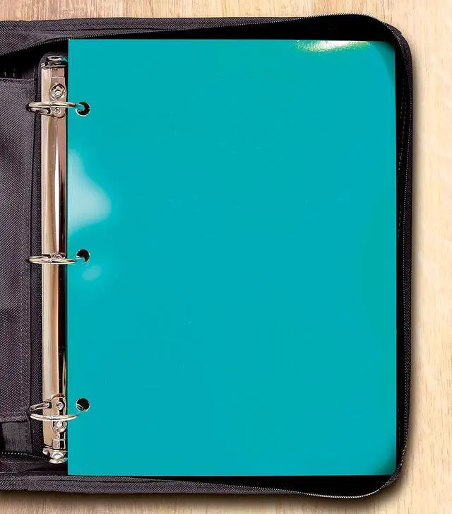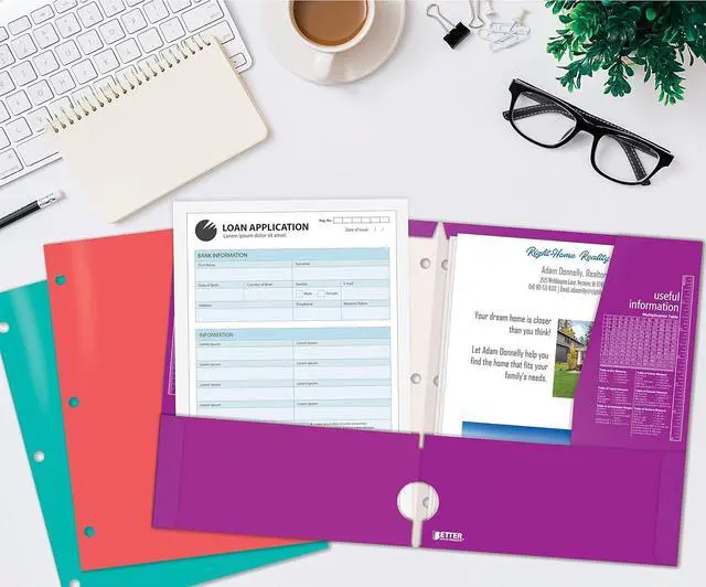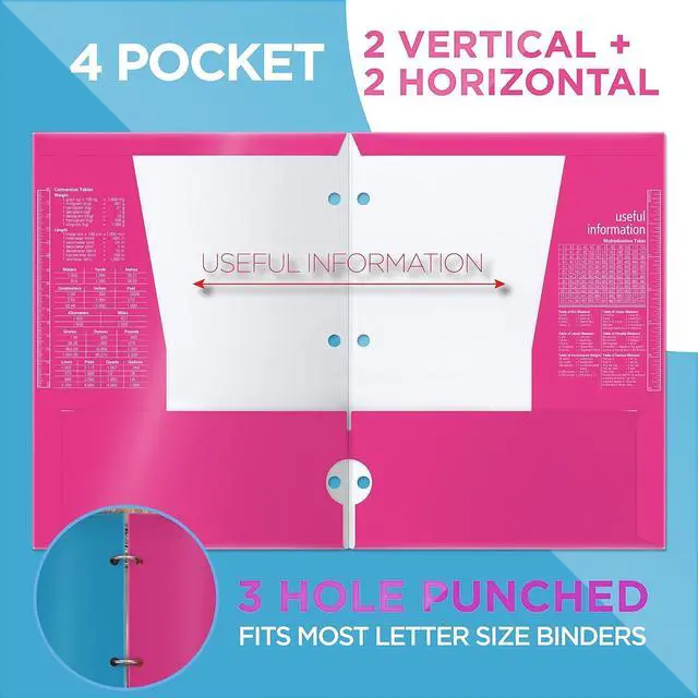6 PACK - 6 complementing solid bright colors in glossy finish on heavyweight 250 gsm paper 12.4 x 11.42 VERTICAL + 2 HORIZONTAL POCKETS - Standard 5 pockets with additional side pockets to ensure papers stay put3 HOLE PUNCHED - Binder-ready folders 3-hole punched to fit most 3-ring bindersUSEFUL INFORMATION - Printed on the interior side pockets are: Standard to metric conversion tables for weight and length rulers (standard English and metric) a multiplication table (1-12) tables of Avoirdupois and table of measure including Dry Liquid Linear Circular and Surface. COLORS - Hot Pink Watermelon Yellow Aquamarine Green Cyan Blue and Purple