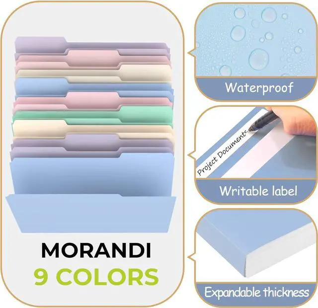 FASHIONABLE COLORSThese premium quality manilla folders in the stunning morandi color palette! This set of 9 colored file folders features a 1/3 cut tab design and is perfectly sized for letter size documents making it an ideal organizational solution for your office or home. PLASTIC FILE FOLDERCrafted from high-quality durable plastic these manilla folders 8.5 x 11 are built to last and can hold up to 200 sheets of paper. The manila file folders morandi color palette adds a touch of elegance to your filing system making it easy to identify and locate important documents. EASILY DISTINGUISHABLE DESIGNIn addition to the 1/3 cut label design the various colors of the manilla folders are excellent distinguishing symbols.