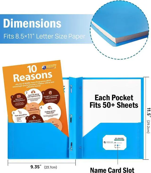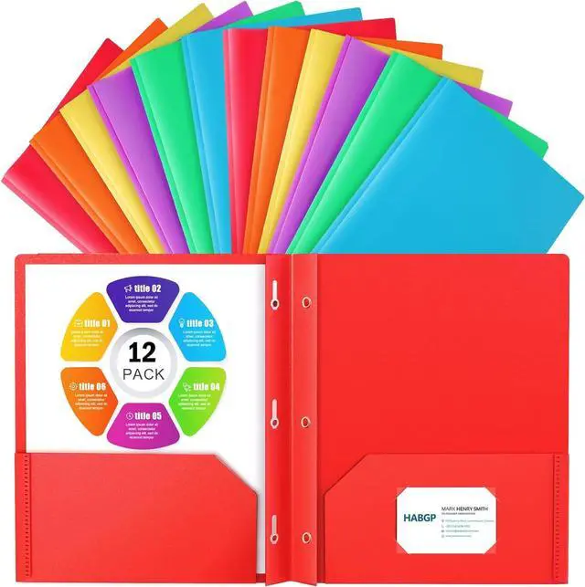FASHIONABLE COLORSThese 2 pockets 3 prong pockets with folders is the perfect size for letter size documents come in a variety of 6 bright colours: Purple Green Orange Blue Yellow Red. An ideal organizational solution for your office school or home. 12 pack in package. EASILY DISTINGUISHABLE DESIGNEach 12 folder features 2 pockets 1 business card slot and 3 prongs for for 3-hole punched paper. Quickly add 3-hole punched paper in this 3-prong design and folders with prongs holds up to 100 sheets in 2 pockets. Whether you're organizing reports files invoices or personal documents these plastic file folders with prongs offer a practical and stylish solution. BUSINESS & OFFICE & SCHOOL ESSENTIALSThe expandable thickness of these 3 prong pockets with folders allows you to store more documents as needed and enjoy a clutter-free workspace that's both functional and aesthetically pleasing. Plus the plastic folders with prongs sturdy yet resilient plastic and construction ensure that your documents will remain safe and secure. PLASTIC FILE FOLDERCrafted from high-quality heavy duty plastic these plastic folders with pockets and prongs 8.5 x 11 are built to last long. The 3 prong pockets with folders multiple colors adds a touch of elegance to your filing system making it easy to identify and locate important documents. QUALITY ASSURANCEHABGP is a professional file folders designer these colorful 3 prong pockets with folders are our classic products.