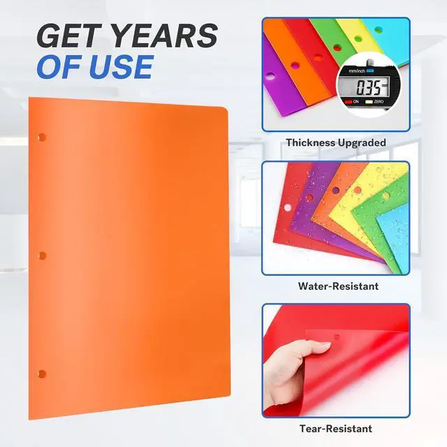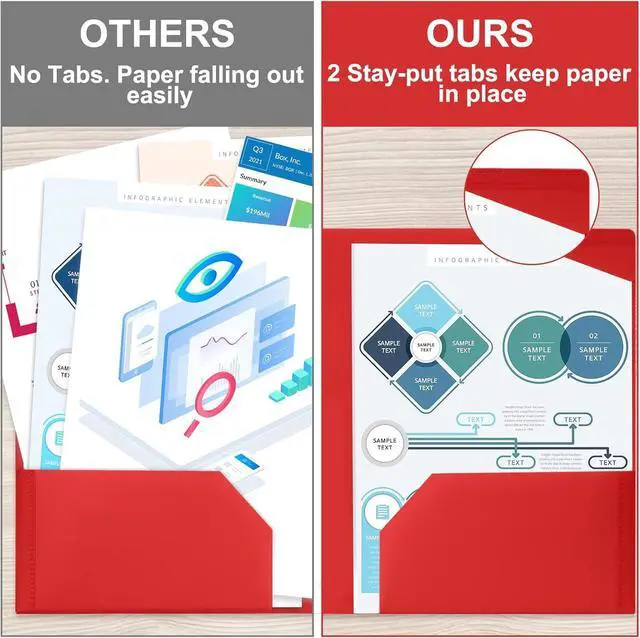 Stable & sturdy Material: Our folder is 0.35 mm thick. The thickness of our plastic folders exceeds that of our rivals' even twice thick. Made of durable and cleanable poly material water-resistant tear-resistant and acid-free folders can last for many years. Dimension & CapacityEach 9.45L x 11.65W plastic 2 pocket folders come with two 5 high pockets that each can safely hold up more than 50 letter-sized documents sales sheets brochures and more.