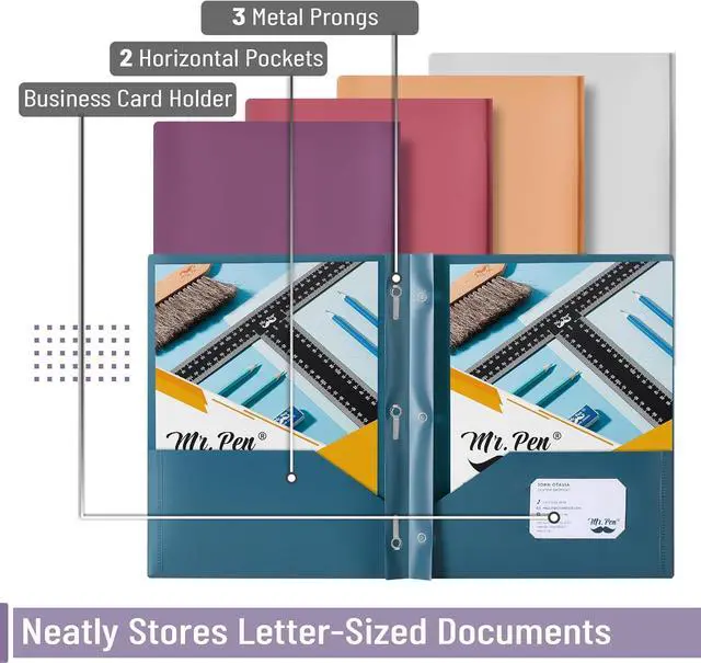 The pack contains 5 folders each presented in an elegantly curated vibrant hue infusing a blend of sophistication and charm into your document storage. Crafted from high-quality plastic Mr. Pen file folders offer superior resistance to wear tear and moisture ensuring your documents remain pristine and protected. Designed with two spacious pockets and a trio of center prongs these folders facilitate both loose and bound document storage ensuring effortless organization and accessibility of papers. With dimensions of 11.5 x 9.35 the folders are tailored to snugly accommodate standard-sized papers guaranteeing a neat tidy and crease-free storage solution.