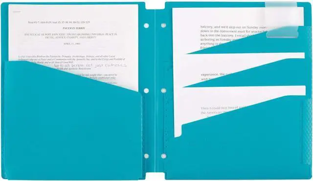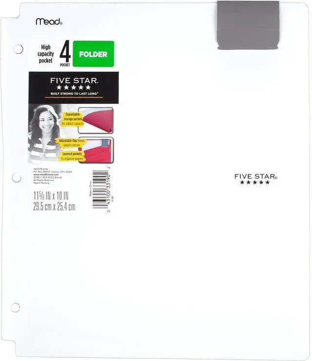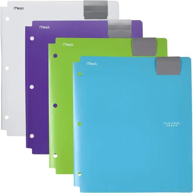 LASTS ALL YEAR. GUARANTEED! *1 pocket is on the left with 3 layered pockets on the right for organization options. The expandable single pocket can hold up to 300 sheets. Durable plastic construction can withstand everyday wear and tear throughout the school year3-hole punched to store in your favorite Five Star binder. An adjustable flap helps keep folder closed. Holds 8-1/2 x 11 papers. 4 pack includes Teal White Purple and Lime.