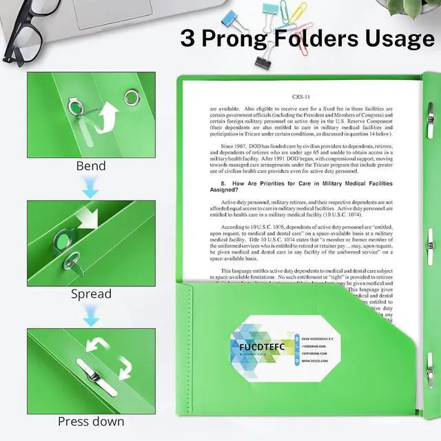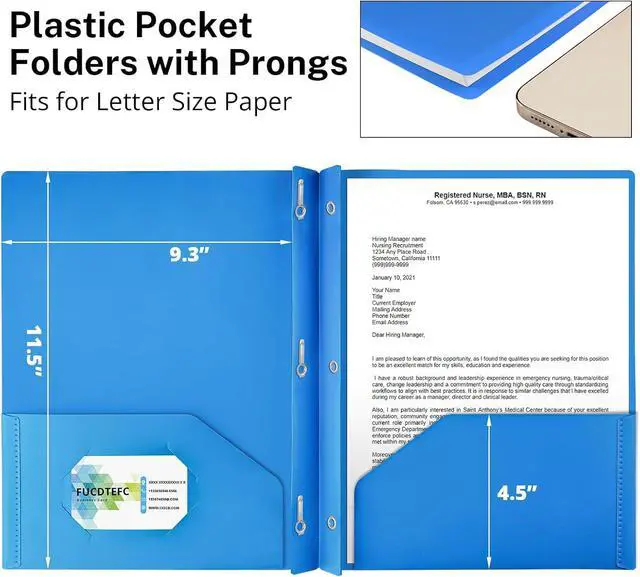 ?? Assorted Colors12 letter-sized folders with two pockets and 3-hole punch prong fasteners making it easier to organize the paper and documents for not only make your folders stand out but also greatly help you manage files. Included 6 bright colors of red yellow orange blue purple green.?? 2 Pocket 3 Prong FoldersThe main 2 Pocket folders is spacious enough to hold a stack of papers or documents. Plus the built-in business card holder keeps your contacts organized and easily accessible. 3 prongs for fastening 3-hole punched paper. No more fumbling through a messy bag or desk drawer to find what you need everything will be neatly organized and easily accessible with these Plastic Pocket Folders with Prongs.
