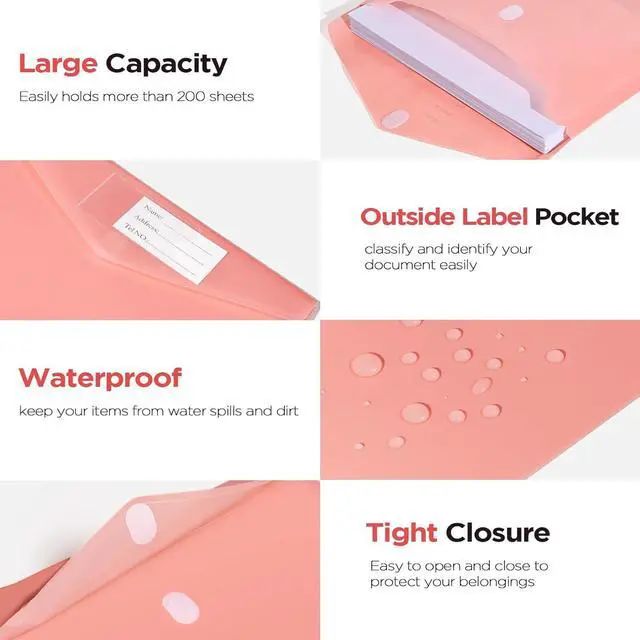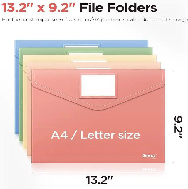 Outside Label Pocket: 13.2 x 9.2 file folders easily holds more than 200 sheets. Fit for the paper size of US letter/A4 prints or smaller document storage. Classify and identify your documents easily with the outside label pocket.