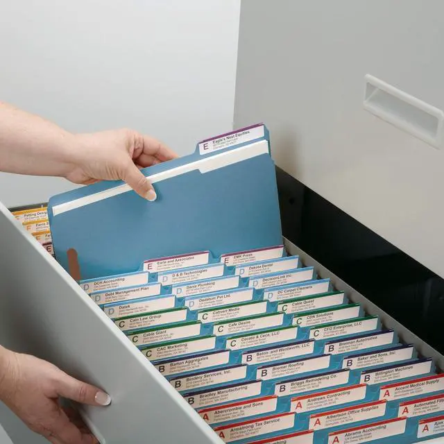 Includes 21 letter size (11-5/8 W x 9-1/2 H overall 9 H body) 1/3-cut tab file folders with 2 filing surfaces per folder for documents that need to stay in a specific orderEach top tab file folder has 2 separate filing surfaces for organizing important documents ensuring they are secure protected and easy to access for maximum efficiencyHeavy-duty folders feature built-in reinforced 1/3-cut tabs to label by hand or with self-adhesive labels reducing wear on folders that get a lot of use or are transported out of the officeDurable and long-lasting these fastener folders can be used for categorizing by color for filing ease holding up to 3/4 of patient paperwork client documents or ledgersProudly made in the USA these sturdy colored folders contain 10% recycled content 10% post-consumer material and are SFI Sourcing Certified
