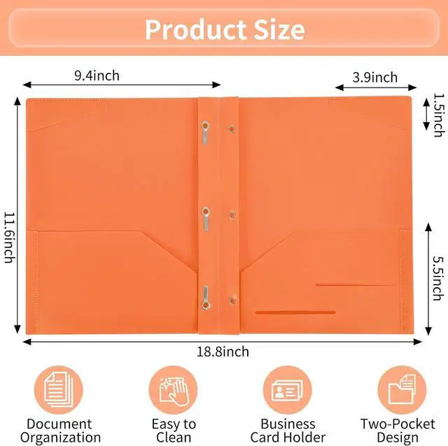 [Package contains] 20 brightly colored heavy-duty folders with 3 prongs folders measure 11.7 x 9.4 inches and are suitable for fixed storage of A4/letter size paper. [Multiple colors] Available in 10 different colors dark green light blue rose yellow red light green orange and so on. Convenient for you to quickly organize and identify different documents. [Special] Each plastic folder has a clear pocket on the cover 2 pockets inside 3 prongs 2 card slots and 2 top fixed corner guards. You can customize your own covers with different themes or store 3-hole punched or unpunched paper.