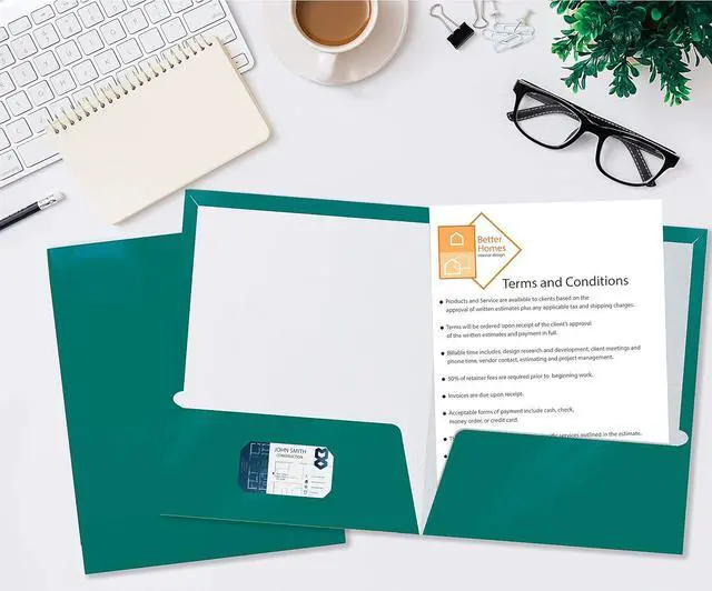 TO LAST: laminated heavy duty paperboard (250 gsm/90 lb. cover) with folded reinforced edges for longer use and protection against spills and smudgesPRESENTATION: Two interior flat pockets that hold 50 sheets each and a business card slot in left pocketMULTI-USE: Great for school students music students home or office organizing presentations and projectsCOLOR THAT POPS!