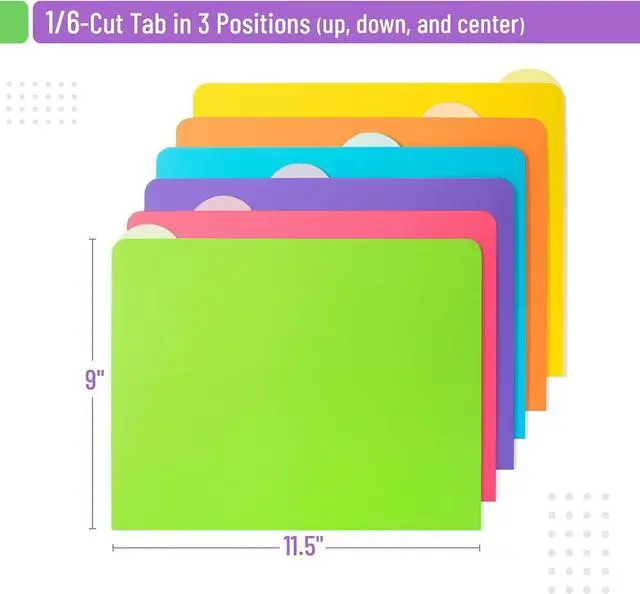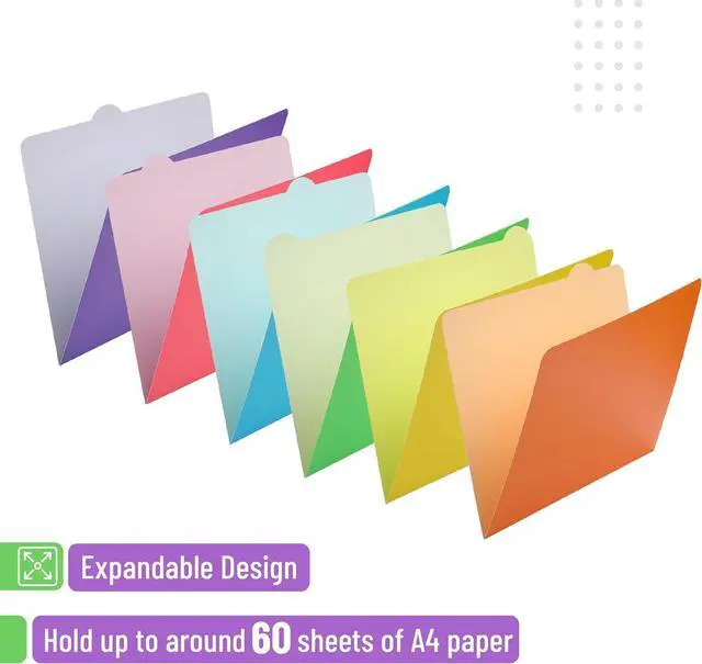 Mr. Pen file folders come in a pack of 6 featuring bright eye-catching colors for effortless organization and categorization. Crafted from high-quality durable paper these folders offer reliable protection while remaining lightweight and easy to handle. Measuring 9 x 11.5 they are perfectly sized to store and safeguard standard letter-sized documents without bending or creasing. Designed with 1/6-cut staggered tabs they allow for quick labeling and easy file retrieval enhancing efficiency. Ideal for office school or home use these folders help maintain a tidy workspace and keep important paperwork neatly organized.
