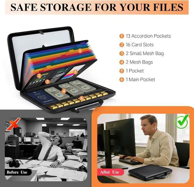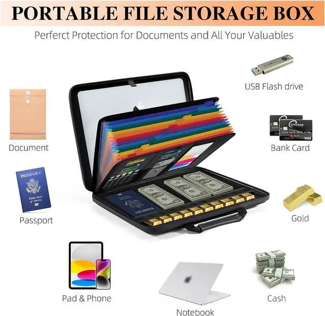 &: Our fireproof document box, measuring 14.8 " × 10.7 " × 2.4 ", is much more portable and lightweight than larger fireproof boxes on the market. It features a multi-tier design with 13 accordion pockets, 16 card slots, 2 small mesh bags, 2 mesh bags, 1 pocket, and 1 main pocket. This design allows it to store important documents, money, passports, USB drives, cards, ID cards, laptops, certificates, and books safely and neatly. It is perfect for daily document management and storage.