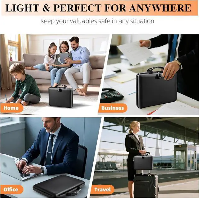 : This fire proof file box comes with a detachable combination lock (no keys needed! ), making it both secure and super convenient. Just lock it up when you need to, or toss the lock inside when you dont. It waterproof dual metal zippers that glide effortlessly and resist high-pressure hose spray. The sturdy leather handle makes it easy to carry around. Perfect for business, travel, the office, school, or homeit keeps your important documents safe and sound.
