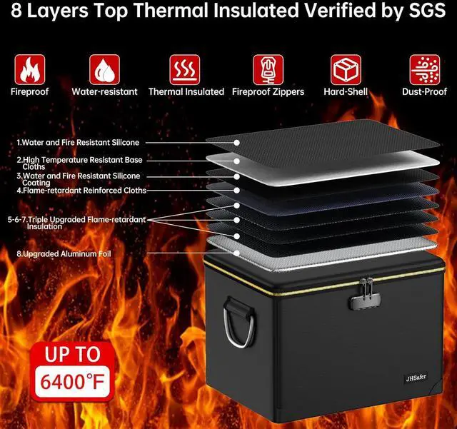 Upgraded Fireproof Protection: Engineered with multi-layer thickened aluminum foil and fireproof insulation, this fireproof file cabinet delivers unmatched flame resistancetested to withstand heat for 30+ minutes without documents damaging. The reinforced aluminum foil core ensures multi-layer thermal shielding, with sealed heat-resistant layers including an oxygen barrier to starve flames and prevent paper combustion/charring, while fireproof threads and seams prevent flame penetration. SGS Certified (UL94 VTM-0) for superior performance, fireproof file box safeguards passports, USB drives, and critical documents from flames