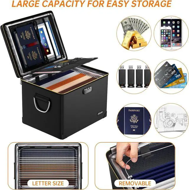 Large Organized Storage: With exterior dimensions of 16.9 " x 12.6 " x 14.2 " (interior: 12.99 " x 10.24 " x 11" ), this fireproof box is specifically designed to accommodate letter-size files (but is not suitable for legal-size files), while providing ample space for photos, passports, and important documents. Its versatile design serves as both a secure file cabinet and emergency organizer, offering reliable protection for home or office use. The generous capacity maintains full compatibility with standard filing systems while ensuring easy organization of your valuables