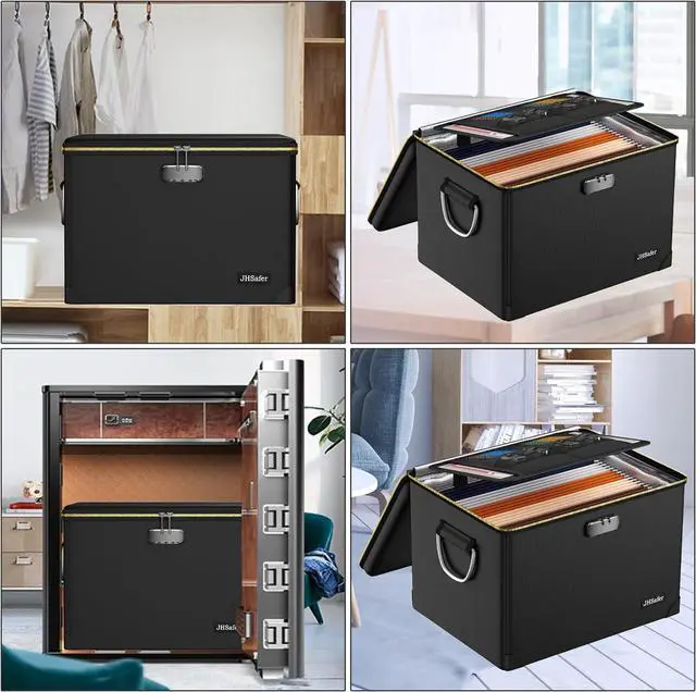 Hard & Durable Design: Crafted with multi-layered materials and a rugged shell, our fireproof safe box effectively resists fire and water damage (waterproof against spills/splashes but not designed for full immersion), while being capable of withstanding significant weight. The fireproof document box is equipped with sturdy side handles for easy storage and portability