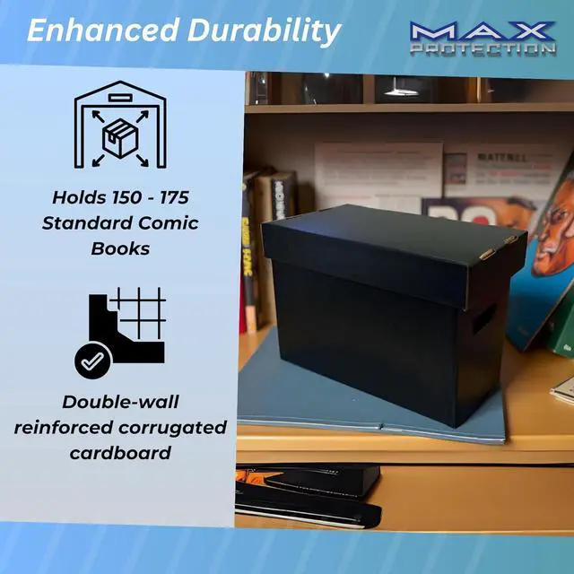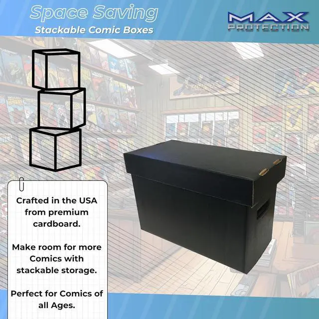 : Revel in the unparalleled storage capability of the Max Protection comic book box, designed to neatly hold 150-175 comics without cramping or crowding; ideal for serious collectors seeking both high-capacity storage and impeccable organization. With high-quality stackable cardboard, these boxes keep your treasured collection readily accessible and orderly, showcasing your meticulous attention to detail and passion for preserving comic history.