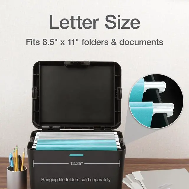 Organize letter size hanging files (sold separately) in this durable plastic file box; the lid & handle each latch down, so it stays securely closed & the material wipes clean with a disinfecting wipe
