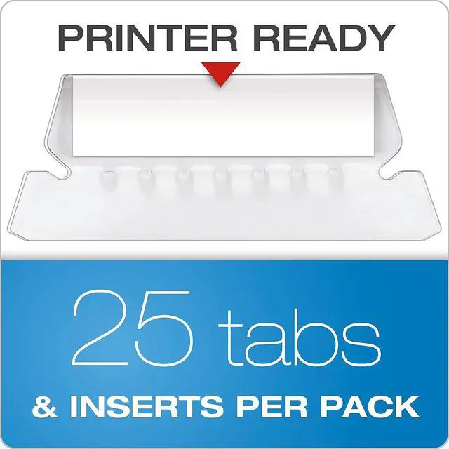 - Includes a printable label sheet and 25 clear 1/5-cut tabs
