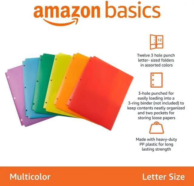 Plastic 3 Hole Punch Folders with 2 Pockets, 8.5 x 11 inches, Pack of 12, Assorted Color