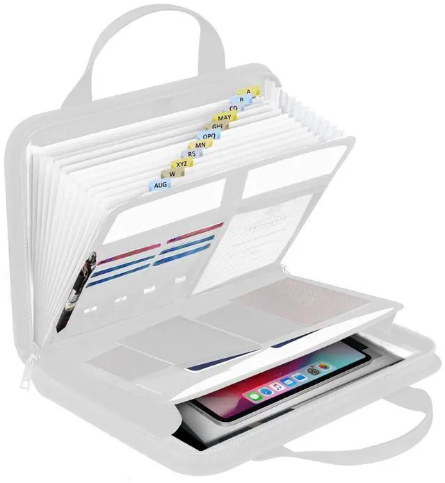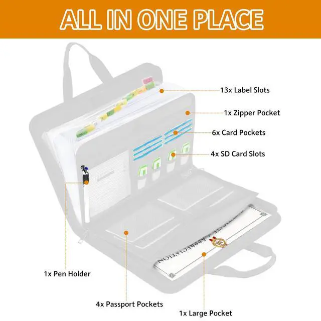 • Enough Space: 14.1 x11.4 x2. Our folio document organizer has 1 zippered pockets, 1 pen slots, 4 SD card slots, 13 label pockets(Fit Letter or A4), 6 card pockets, 4 medium mesh pockets and 1 main large pocket