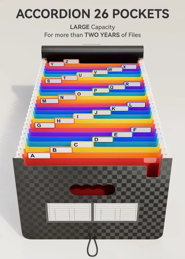 ACCORDION LARGE CAPACITYExpandable monthly bill organizer can be extended to 28, stand stably. 26 pockets allow you to store more than 4500 sheets.26 pockets enough for more than two years of documents, which is durable and sturdy.