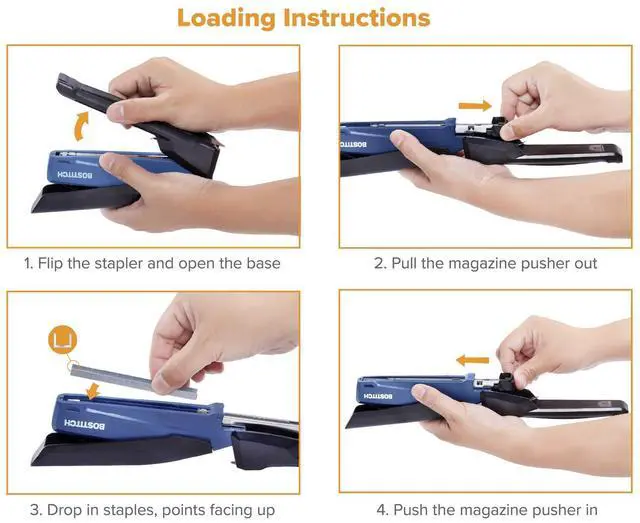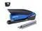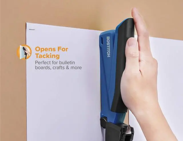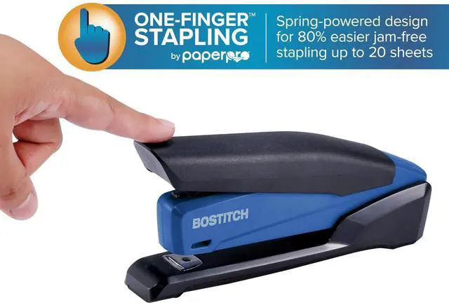 The Bostitch Office EZ Squeeze Spring Powered Stapler, 20 Sheets, Blue is the newest addition to our line of one-finger stapling. This lightweight, navy blue stapler features the exclusive Bostitch Office One-Finger technology that boasts a spring-powered design to make stapling that much easier! No more hand slamming or elbow cracking when trying to staple 20 sheets of paper or less. Not only does this stapler feature EZ Squeeze technology, it also features a No-Jam technology so you can say goodbye to frustrating staple jams. Easily load a full strip of standard staples that you can securely store in the staple storage compartment located at the bottom of the stapler. Accidentally staple something? Set your worries aside as this stapler is constructed with a built-in stapler remover. The stapler also opens 180 degrees for bulletin board tacking and craft use, making it the perfect accessory for any office, school or home office.