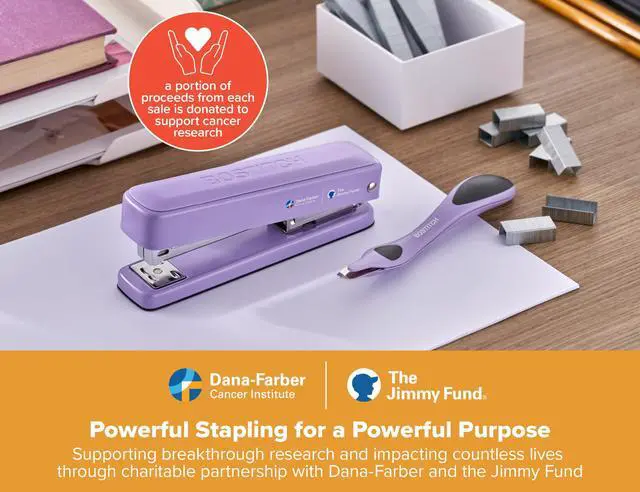 Heavy-duty performance meets sleek designthe Titan has arrived. Engineered to staple up to 50 sheets, this powerhouse delivers twice the capacity of standard staplers: easily fasten 225 pages with standard staples or 2650 pages using extended 5/16" staples. Crafted from durable metal with a non-skid rubber base, this set includes 1,250 1/4" standard staples, 500 5/16" extended staples, and an ergonomic, push-style staple remover for smooth and comfortable use. Equipped with No-Jam Technology, the Titan keeps your workflow seamless. It also opens 180 degrees for bulletin board tacking, arts and crafts, and more making it a versatile addition to any workspace at home, in the office, or in the classroom. Your purchase makes a difference: a portion of proceeds supports the Dana-Farber Cancer Institute and The Jimmy Fund, helping to advance cancer research and patient care.