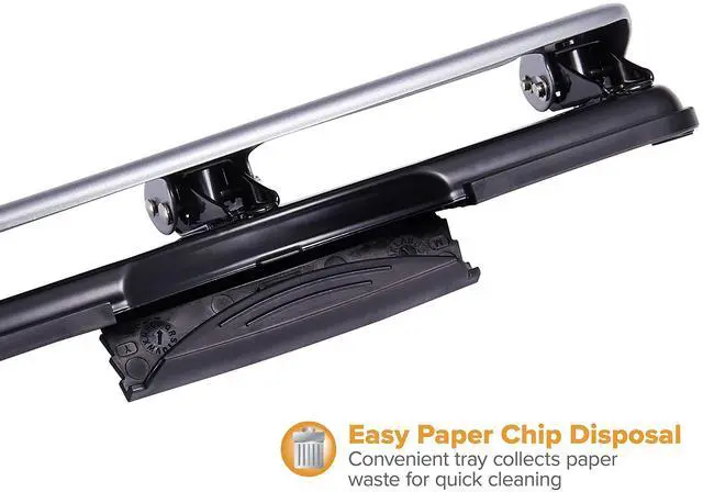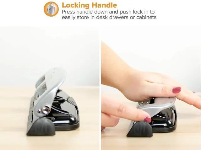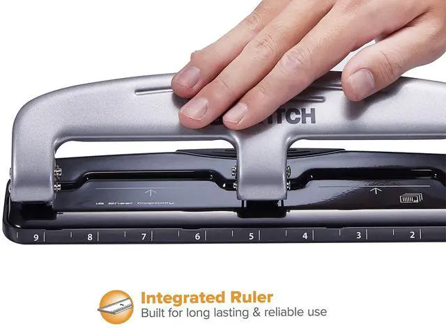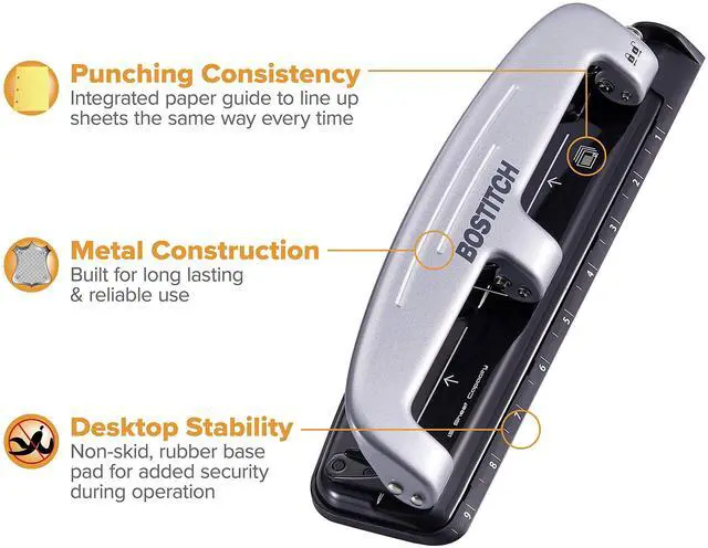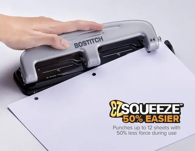 Here at Bostitch, were confident this silver 3-hole punch will impress. With its easy-to-squeeze design that requires a whopping 50% less effort, it also boasts an adjustable paper guide and integrated ruler for quick, precise measurements and hole placement. Dont sweat about jamming this unit the No-Jam technology avoids these issues and ensures smooth operation. This silver three-hole punch is stylish enough to display on any desktop. In fact, we think the sleek and simple look is quite inviting. No room on your desk? No problem! Simply use the handle lock to compress the unit and store it in any space. Its handy for any project or binding task. For desktop protection and slippage, the non-slip base is ultra-convenient. Still not impressed? See the beauty for yourself today!