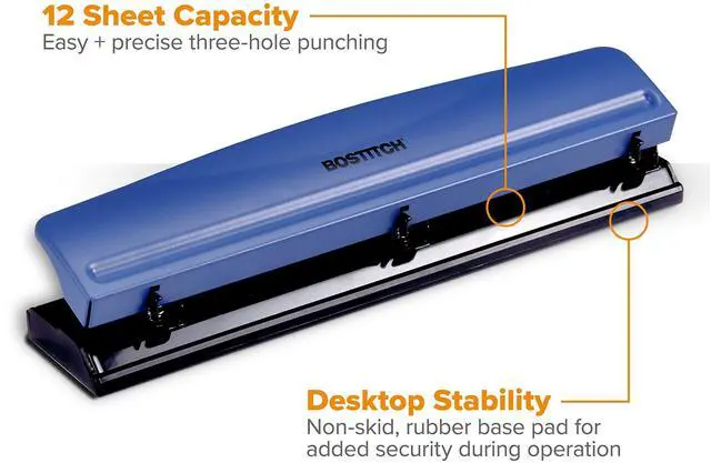 Slim and lightweight, this compact hole punch tackles up to 12 sheets of paper while taking up minimal space on your desktop. Its reduced size allows for convenient storage in cabinets and drawers.