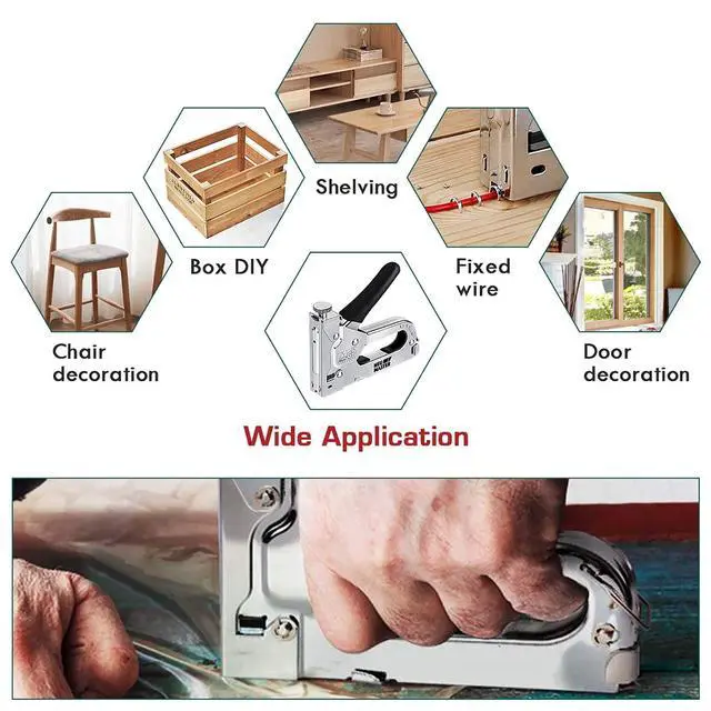 | Applications | Weather stripping, insulation, small fencing, upholstery, and other stapling projects | upholstery, material repair, carpentry, decoration, furniture, DIY, more renovation needs | shelving, pet DIY, box DIY, picture frame, chair decoration, fixed wire, woodworking, door decoration | Wood working, Upholstery Installation, Flooring, Molding, Roofing, Picture framing, Door ,Window projects | Upholstery, Carpentry and Woodworking Projects | Stapling and Nailing of Cardboard, Insulating material, Fabrics, Foils, Leather and etc. |