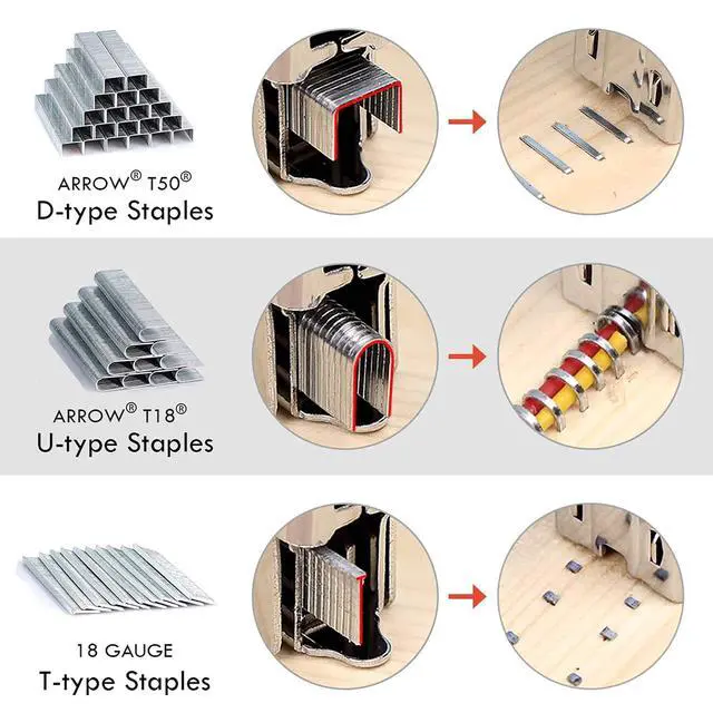 | Staple type | T50, JT21, JT20 & T25 Staples | T50 staple & T18 staple | T50 staple & 18 gauge brad nail | 1/4" crown staple 5/8” to 1-5/8” | 1/4" crown staple 3/4" to 1-1/2" | Type 53/JT21 staples |