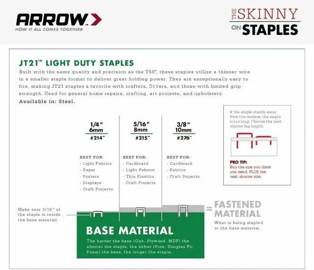Built with the same quality and precision as the T50, JT21 staples utilize a thinner wire in a smaller staple format to deliver great holding power. They are exceptionally easy to fire, making JT21 staples a favorite with crafters, DIYers, and those with limited grip strength. Used for general home repairs, crafting, art projects, and upholstery.