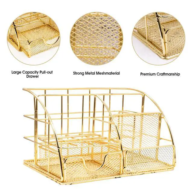 Elegant Desk OrganizersOur cute and stylish desktop organizer features 5 separate compartments and 1 mini sliding drawer. The desktop organizer is adopting with a powder coat finish and electroplating technology ,wear-resistant, anti-oxidation, and long lasting and does not fade . The rounded corners metal rim and trim add to the visual appeal, and protect your desk.