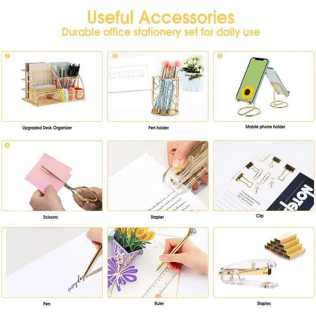 You Will GetYou will get a set of delicate gold office supplies, including a desk organizer, a stapler, a pen holder, a phone holder,scissors, pen, ruler, 30 paper clips, 22 binder clip, 20 tacks and 1000pcs staples to meet your daily office needs. The large desk organizer has the most reasonable size so you can fit all your stationery.